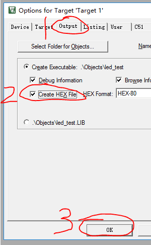 - 选中Output选项卡->勾选Create HEX File->点击OK