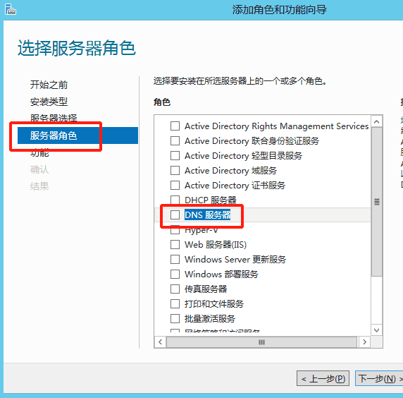 - 点击下一步,直到服务器角色,打勾DNS服务器